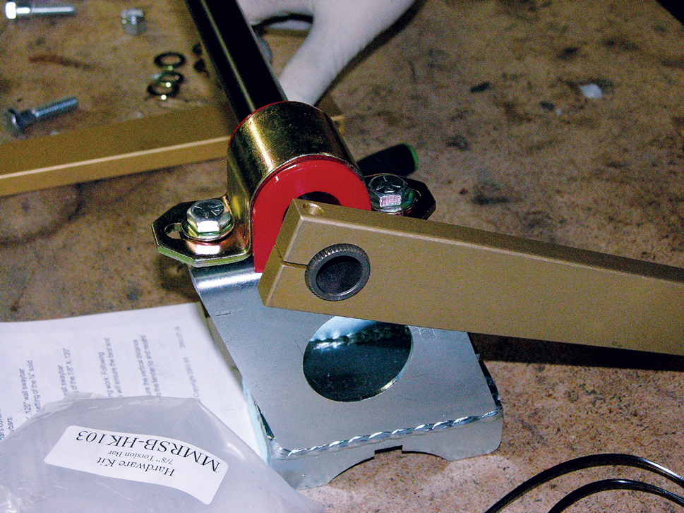 The owner of this Mustang also decided to add an MM adjustable rear sway bar. Assemble each side of the bar as seen here, and make sure to grease the bushings and that each of the aluminum mounts faces the same direction.