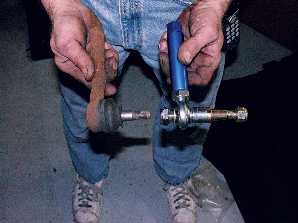 During the install, Chicane also installed an MM bumpsteer kit. This comparison of the stock unit and the new tie-rod end shows the key differences between the two.